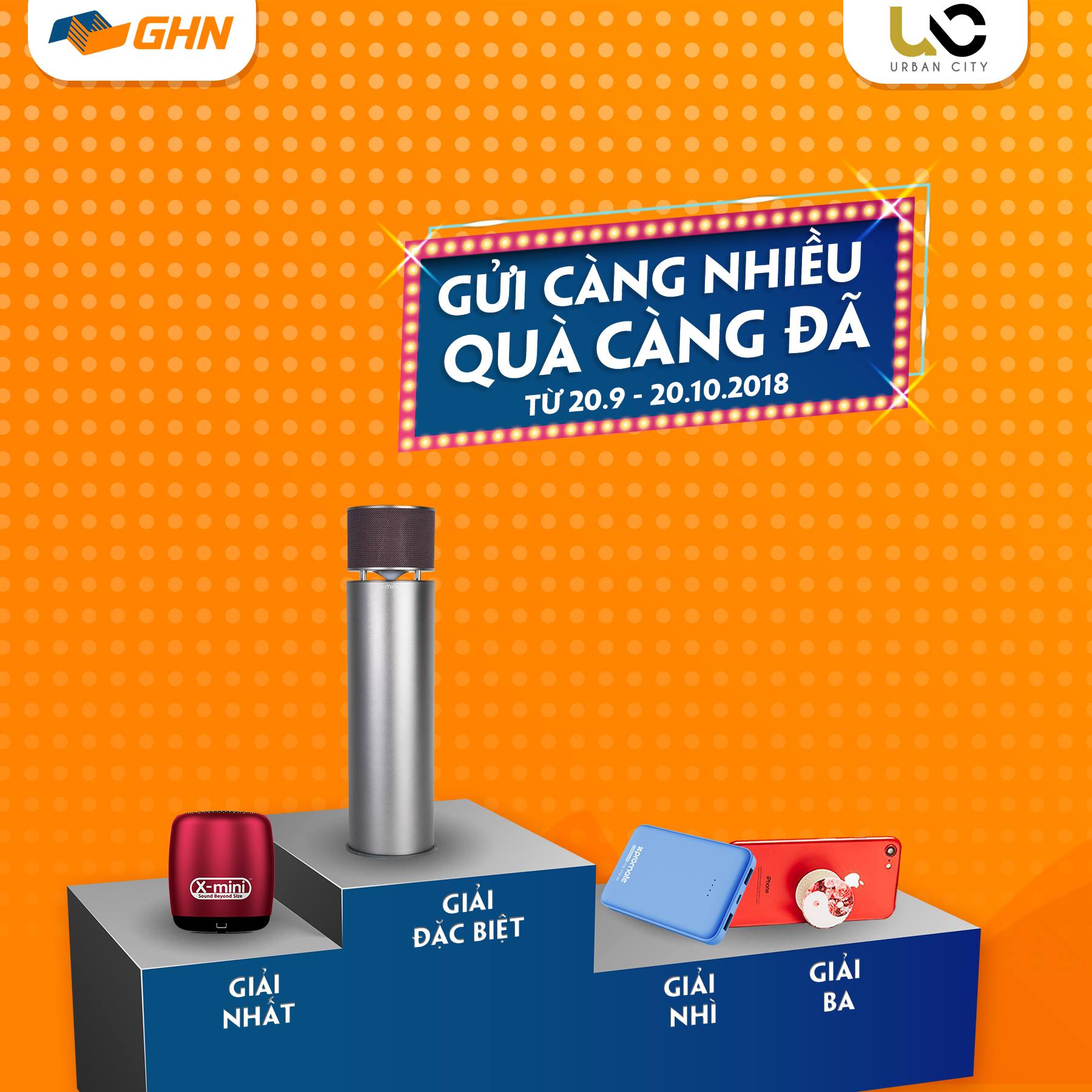 Từ ngày 20/9 đến hết 20/10/2018, khách hàng có tổng số đơn hàng được tạo bởi EXpress thành công cao nhất được tạo bởi GHN Express, sẽ nhận được những giải thưởng cực kỳ giá trị từ Urban City. Khách hàng hợp lệ phải comment ID Khách hàng và tag 3 người bạn trên Bài đăng chính thức của chương trình tại link: https://www.facebook.com/GHNExpress/videos/167390787513373/